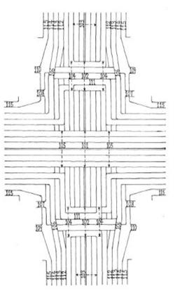 圖1是實(shí)用新型的橋體結(jié)構(gòu)圖路口的中間部位為縱向高架橋101,供縱向直行車輛通過路口,路口兩端架設(shè)縱向路面橋102(上起一高架車道),橫向中間直行車道103為雙盆形地下車道,縱向高架橋101下方隆起至地面,盆底部位上方為縱向路面橋102,車行道路不架設(shè)橋墩,縱向路面橋橋基(代橋墩)104、縱向高架橋橋基105(代橋墩)占用各轉(zhuǎn)彎掉頭車輛共用橫向車道路基。縱向高架橋橋墩位于橫向道路中心線上所標(biāo)101位置。