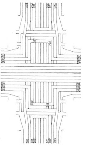 兩橫向左轉(zhuǎn)彎車道202分別通過兩縱向路面橋?qū)崿F(xiàn)無交叉左轉(zhuǎn),橫向左轉(zhuǎn)彎車道202分別穿越縱向路面橋上的縱向左轉(zhuǎn)彎高架車道。兩縱向左轉(zhuǎn)彎車道205分別通過兩縱向路面橋上的高架車道實(shí)現(xiàn)無交叉左轉(zhuǎn),縱向左轉(zhuǎn)彎車道205跨越縱向路面橋上的橫向左轉(zhuǎn)彎車道202。