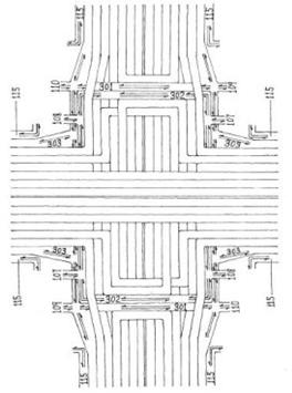 左轉(zhuǎn)彎車道的三層立交設(shè)計(jì),兩橫向左轉(zhuǎn)彎車道202分別通過兩縱向路面橋?qū)崿F(xiàn)無交叉左轉(zhuǎn),橫向左轉(zhuǎn)彎車道分別穿越縱向路面橋上的縱向左轉(zhuǎn)彎高架車道。兩縱向左轉(zhuǎn)彎車道分別通過兩縱向路面橋上的高架車道實(shí)現(xiàn)無交叉左轉(zhuǎn)。右轉(zhuǎn)彎車道為高架,跨越縱向路面橋上的縱向電動(dòng)車道人行道。各調(diào)頭車道進(jìn)出路口均為水平方向,車輛在同一平面行駛,左轉(zhuǎn)調(diào)頭,橫向調(diào)頭車道進(jìn)入路口至縱向路面橋左轉(zhuǎn)調(diào)頭,縱向調(diào)頭車道跨越橫向電動(dòng)車道人行道左轉(zhuǎn)調(diào)頭,中間穿越縱向高架橋。