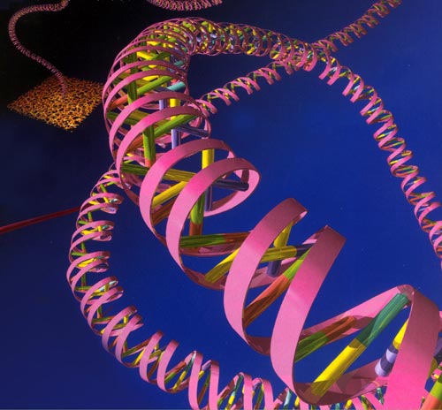 1953年4月25日,世界權(quán)威雜志《自然》雜志發(fā)表了沃森、克里克的一篇900多字優(yōu)美精煉的短文,宣告了DNA分子雙螺旋結(jié)構(gòu)模型的誕生。這個結(jié)構(gòu)模型的要義是:DNA是一個長長的雙鏈分子,由兩條同軸反向相互纏繞的多核苷酸鏈組成,外側(cè)是由脫氧核糖和磷酸根組成的分子骨架,中間是由互補(bǔ)的堿基對組成的階梯,堿基配對方式是A配T,C配G;堿基對間距為0.34納米,每10個堿基對形成一個螺旋周期,螺旋直徑為1納米。這個模型既能從螺旋性、分子直徑、堿基對的幾何學(xué)尺度等方面闡明X射線衍射圖像,又能以堿基專一性互補(bǔ)配對來解釋查伽夫當(dāng)量定律。DNA雙螺旋結(jié)構(gòu)是一個極為成功、無懈可擊的DNA分子結(jié)構(gòu)模型,它由兩條右旋但反向的鏈在同一個軸上盤而成,像一個螺旋形的梯子,生命的遺傳密碼就列在梯子橫檔上。據(jù)科學(xué)家統(tǒng)計,一個體細(xì)胞的全部DNA“螺旋樓梯”長約2米。若將一個人的全部DNA連接起來,可以在地球和太陽之間扯上80個來回。 DNA分子雙螺旋結(jié)構(gòu)模型的發(fā)現(xiàn),是生物學(xué)史上的一座里程碑; 1962年,沃森、克里克因發(fā)現(xiàn)DNA分子結(jié)構(gòu),與改進(jìn)了X射線衍射技術(shù)的威爾金斯一起獲得了諾貝爾醫(yī)學(xué)或生理學(xué)獎。
