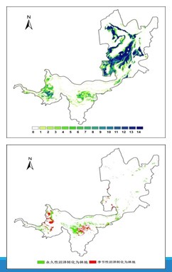 季節(jié)性沼澤減少直接導(dǎo)致珍稀鳥類和魚類食物來(lái)源的減少,造成棲息地環(huán)境質(zhì)量下降甚至破壞;季節(jié)性沼澤的喪失和退化將使洞庭湖濕地的生物多樣性降低。最顯著的是西洞庭湖和南洞庭湖區(qū)林地面積的快速增加,主要由沼澤轉(zhuǎn)化而來(lái),如圖,其中永久性沼澤轉(zhuǎn)化為林地共14800 公頃,由季節(jié)性沼澤轉(zhuǎn)化為林地為7900公頃 。