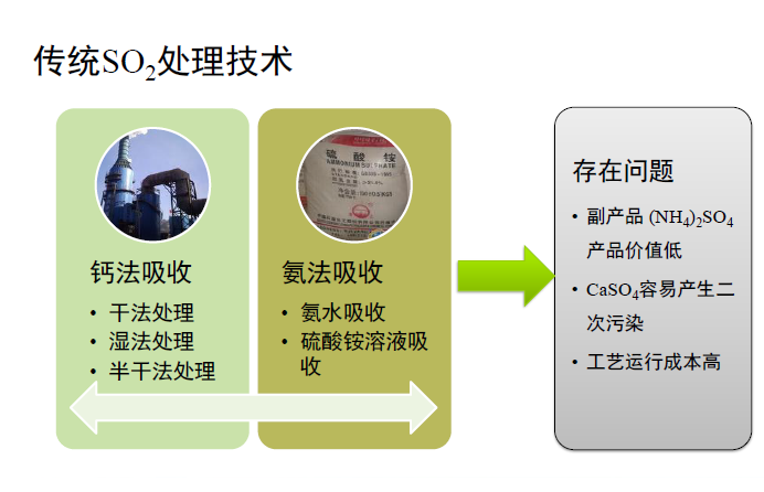 傳統(tǒng)的二氧化硫處理技術(shù)主要有鈣法吸收、氨法吸收,二者均存在運行成本高,易產(chǎn)生二次污染的問題。