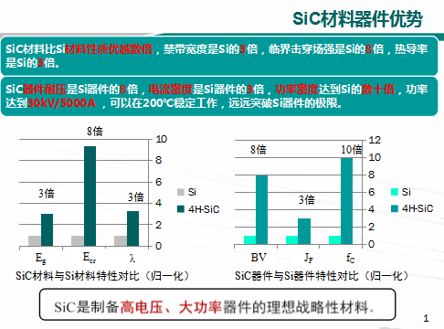 在電力裝備中電力電子器件是最重要的部分之一,但是,目前電網(wǎng)輸送電壓500kV、800kV甚至達(dá)到1100kV,最基本的電力電子器件,Si器件,已經(jīng)達(dá)到了由Si材料性能確定的極限,難以滿足智能電網(wǎng)的要求,更高電壓、更大容量、更高效率、更高結(jié)溫,亟需新型戰(zhàn)略性的材料器件體系。SiC材料的禁帶寬度是Si的3倍,臨界擊穿場強8倍,熱導(dǎo)率是3倍,材料性能優(yōu)勢明顯。SiC器件的耐壓是Si器件的10倍,電流密度3倍,頻率是Si的10倍,是制備高電壓、大功率器件的新型戰(zhàn)略性材料。