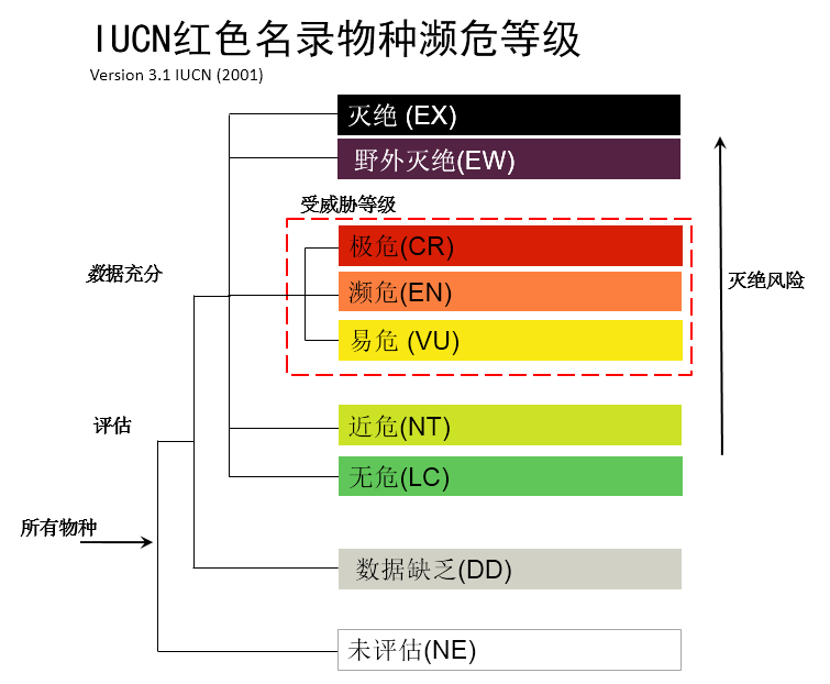 IUCN自20世紀(jì)60年代成立之日起,就設(shè)立了物種生存委員會(huì)(SSC),開(kāi)始編制和印刷《IUCN瀕危物種紅皮書(shū)》,后來(lái)隨著評(píng)估物種的增加,印刷版逐步發(fā)展為網(wǎng)絡(luò)版的《IUCN瀕危物種紅色名錄》,定期編制發(fā)布。IUCN/SSC研究制定了《IUCN物種紅色名錄瀕危等級(jí)和標(biāo)準(zhǔn)》,根據(jù)物種的種群數(shù)量和分布情況等,評(píng)估其生存狀況,確定其瀕危等級(jí)。IUCN瀕危物種等級(jí)標(biāo)準(zhǔn)分為“有評(píng)估數(shù)據(jù)”和“數(shù)據(jù)缺乏”兩類(lèi),“有數(shù)據(jù)評(píng)估”中又分為“滅絕”、“野外滅絕”、“區(qū)域滅絕”、“極?!?、“瀕危”、“易危”、“近?!焙汀盁o(wú)?!钡?個(gè)級(jí)別,從“無(wú)?!钡健皹O危”,滅絕風(fēng)險(xiǎn)逐步上升,瀕危等級(jí)逐步增加。瀕危等級(jí)標(biāo)準(zhǔn)有5個(gè)指標(biāo),分別是種群下降、有限地理分布區(qū)、下降小種群、非常小或非常有限的種群、以及模型模擬等量化分析,根據(jù)這些指標(biāo)的數(shù)量閾值,來(lái)評(píng)估物種的瀕危等級(jí)。