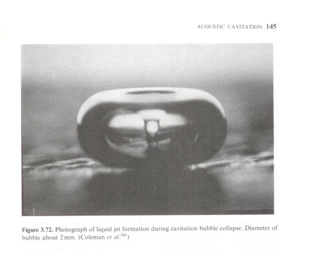 再解釋一下氣泡的潰滅。氣泡的潰滅與氣泡的破滅是完全不同的過(guò)程。氣泡的潰滅是指氣泡由大變小,最后變沒(méi)的過(guò)程,這不同于氣球由小到大最終破滅的過(guò)程。破滅產(chǎn)生不了高溫、高壓,只有潰滅才能產(chǎn)生高溫、高壓。我們講氣泡的潰滅,有的人叫湮滅,有的人叫塌縮等等,這是學(xué)術(shù)上的不同說(shuō)法。