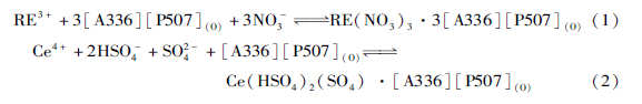離子液體萃取稀土離子的過程機(jī)理還是比較復(fù)雜的,這種復(fù)雜來自于很多方面。其萃取稀土(III)和缽( IV)的機(jī)理還是以中性絡(luò)合機(jī)理為主,如萃取平衡方程(1)和(2)所示,同時可能還伴隨一些副反應(yīng)。該過程萃取稀土鹽,酸堿消耗比較小,是提高稀土萃取效率的重要方式之一。
