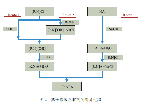 離子液體萃取劑的制備過程如圖2所示,包括將季錢鹽[R4N ]C1制備成季錢堿[R4N ]OH,然后與有機(jī)酸HA反應(yīng)生成[R4N]A?;蛘邔⒂袡C(jī)酸HA與堿反應(yīng)生成A一Na,然后與[R4N ]C1反應(yīng)生成[RQN]A。前一個制備過程,尤其是利用KOH更加簡單、低成本,產(chǎn)品的純度高。此外,離子液體萃取劑制備過程簡單,反應(yīng)時間短,條件溫和,產(chǎn)品收率高,適合大規(guī)模的生產(chǎn)。申請者利用工業(yè)原料N263 ( Aliquat336的國產(chǎn)化的商品)與P507制備的[A336][P507]價格僅為170元/千克左右。另外,離子液體萃取劑性質(zhì)穩(wěn)定,經(jīng)過多次循環(huán)仍保持其萃取性能。此外,其水溶性較低,溶解度一般小于50ppm。這些都符合大規(guī)模工業(yè)應(yīng)用的潛在條件。