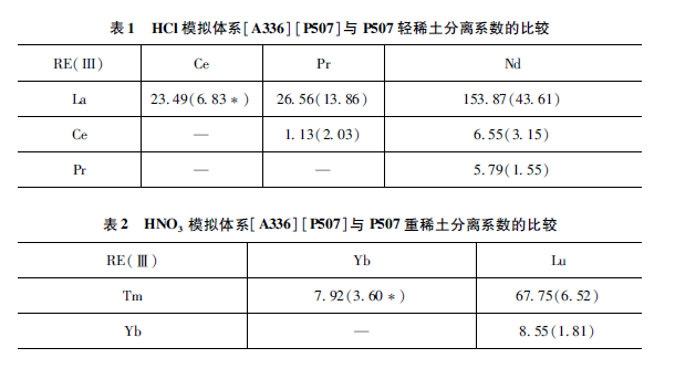 P507(III)萃取稀土按照正序萃取,遵循“四分組效應(yīng)”,稀土的分配系數(shù)隨著原子序數(shù)的增加而增大,而堿性萃取劑[A336]C1在HN03體系中通過陰離子交換萃取稀土是倒序萃取,稀土的分配系數(shù)隨著原子序數(shù)的增加而減小。兩種效應(yīng)共同作用,導(dǎo)致[A336 ] [ P507 ]分離稀土選擇性增強(qiáng),相鄰元素間的分離系數(shù)明顯提高。同時,陽離子[A336]+和陰離子[P507 ]-的離子半徑大,空間位阻增加,也有助于提高稀土(III)的萃取選擇性。模擬實(shí)際體系的組分混合物,在HCl體系中在輕稀土間的分離系數(shù)也有較大的提高,尤其是Pr/Nd分離系數(shù)5. 79明顯高于P507體系的1. 55(徐光憲主編,《稀土》,第二版,1995 ) ,見表1。在HN03體系中重稀土Tm/Yb/Lu的分離系數(shù)較大,明顯高于目前的P507體系(李德謙等,中國發(fā)明專利,ZL200510016682. 6 ),見表2。[A336 ] [P507 ]的特殊結(jié)構(gòu)對部分稀土離子分離的選擇性方面比較突出,與其較大的空間位阻有關(guān)。