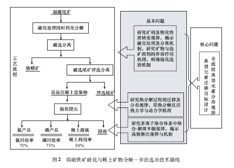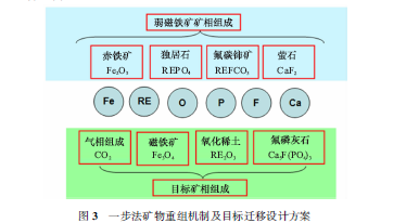 為實(shí)現(xiàn)上述目標(biāo),弱磁鐵礦磁化與稀土礦物分解一步法礦物重組機(jī)制及目標(biāo)遷移設(shè)計方案如圖3所示。