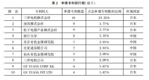 從不同年份上來看,中國專利不斷增加,原來口本比中國多,后來中國慢慢增多。但實(shí)用的還是不多,仍然還是一個問題,還得有進(jìn)一步的提高。另外,從申請單位來看,排在前十名的都是中國和口本的一些單位(表2)。比如說三洋電機(jī)株式會社、湯淺株式會社、松下電器產(chǎn)業(yè)株式會社、浙江大學(xué)、北京有色金屬研究院、比亞迪等。