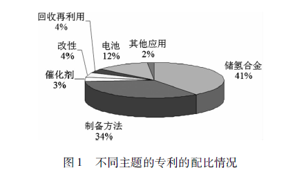 這里面是不同的研究主題分布,還是以儲氫合金的開發(fā)居多一點(diǎn),然后還有催化劑、改性等(圖1)。我覺得在這里面可能有三個領(lǐng)域在技術(shù)上發(fā)展比較突出一點(diǎn)。第一個就是成分的改變,通過改變儲氫合金成分開發(fā)新的合金提高了鎳氫電池容量,是一個很重要的進(jìn)步。傳統(tǒng)是ABS型的,后來跟ABS型的和AB2型的結(jié)合到一起,就變成了A2B7型的,這就是口本三洋公司開發(fā)出來的。這個儲氫合金成為了目前研究的主流,容量比傳統(tǒng)的要大很多,成分上的突破是一個很大的進(jìn)步。第二個是甩帶快淬技術(shù)在儲氫合金粉體制備上的應(yīng)用,原來這種技術(shù)最早是用來制備非晶態(tài)合金的,后來用到了永磁粉體的制備,現(xiàn)在又開始進(jìn)人到了鎳氫電池上面來了,對于鎳氫電池容量和穩(wěn)定性的提高都有非常大的幫助。第三個重要的突破的是儲氫合金表面改性,表面有一層鎳,可以進(jìn)一步提高電導(dǎo)率,增加電流。這三方面是在技術(shù)上有了比較大的提高和發(fā)展。