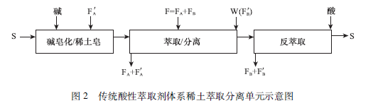 傳統(tǒng)酸性萃取劑體系稀土萃取分離流程,每一個分離單元的工藝如圖2所示,萃取劑有機(jī)相S需要用堿皂化,萃取難萃稀土A制取負(fù)載難萃稀土有機(jī)相,進(jìn)人分離段交換萃取分離對象(A和B)中的易萃稀土B以獲得純稀土A水相,隨后用純易萃稀土B洗滌萃取劑有機(jī)相中的難萃稀土A以獲得負(fù)載純易萃稀土B的有機(jī)相,最后用酸反萃取使B轉(zhuǎn)型至水相,萃取劑有機(jī)相得到再生循環(huán)使用。