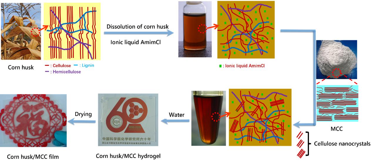 我們做出的兩類離子液體溶劑,可以在一個很溫和的條件下(一般不超過100℃)將纖維素溶解。過去一二十年有很多人做纖維素的離子液體體系,目前公認(rèn)最好的三種離子液體中有兩種是我們發(fā)明的,其中AmimCl可以溶解木材,被稱為溶解能力最強(qiáng)的溶劑。后來我們提出了它的溶解機(jī)理,我們認(rèn)為離子液體陰陽離子結(jié)構(gòu)和纖維素羥基的分別作用把里面原來氫鍵打開,像剪漁網(wǎng)似的,使它變成線性的分子才能溶解。