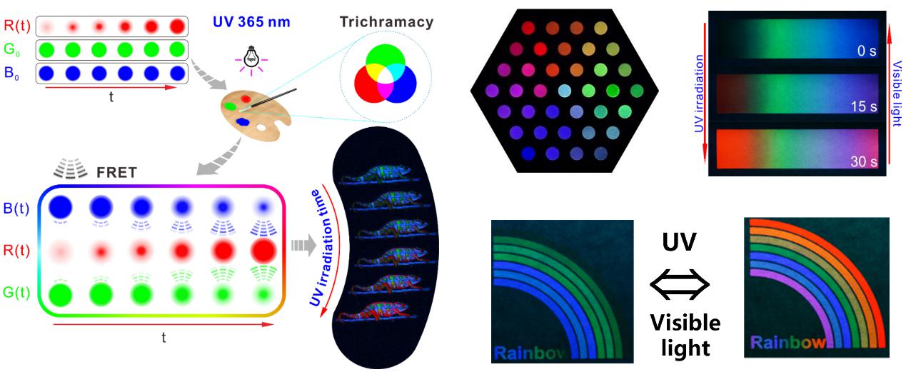 比如發(fā)光的防偽材料,利用纖維素均相可控反應(yīng)的優(yōu)勢,把原來容易聚在一起的熒光分子,通過化學(xué)方法鍵合到纖維素上,克服了溶液狀態(tài)下聚集誘導(dǎo)淬滅效應(yīng),將其制成固態(tài)熒光材料,同時(shí)它仍然具有高分子的可打印、可噴涂的特點(diǎn),將不同的發(fā)光基團(tuán)接到不同的纖維素上可以得到不同的顏色,將紅、綠和藍(lán)三種顏色的纖維素衍生物共混,利用三基色原理,還可以做打印的動態(tài)熒光材料(圖5)。