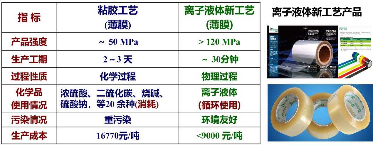 以前纖維素制膜工藝污染很大,中國逐漸在關(guān)停。而我們的離子液體工藝是物理溶解,基本沒有污染。原來工藝需要三天時(shí)間,現(xiàn)在三十分鐘就做出來了(圖8)。在車間里面都聞不到氣味,火都點(diǎn)不著,非常安全。其中溶劑是我們的專利,包括后面的溶劑回收,溶劑是可以回收再反復(fù)利用的。用我們這個工藝與企業(yè)合作建立了生產(chǎn)線,2019年基本已經(jīng)建成了,今年11月底試車。生產(chǎn)的產(chǎn)品推薦在快遞物流上使用,特別是用低成本秸稈做的膠帶,有很好的應(yīng)用前景。